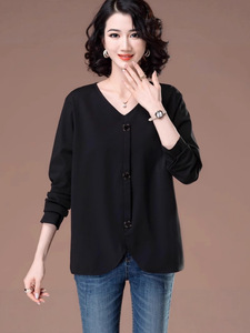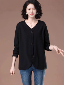黑色V领t恤女长袖2025新款中老年妈妈春秋薄款上衣大码遮肚打底衫