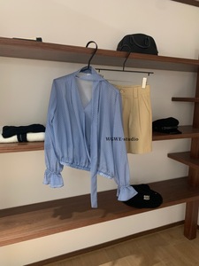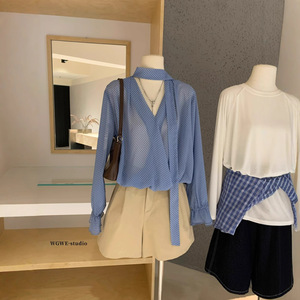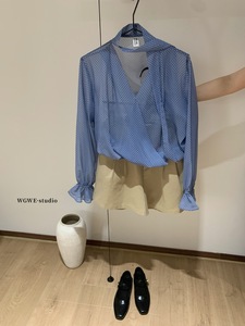 【WGWE】6795清冷氧气感时髦蓝色挂脖飘带波点宽松长袖衬衣小衫