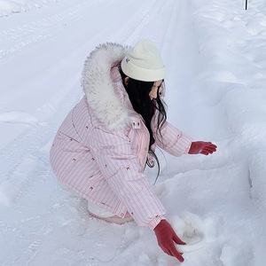 条纹印花加厚保暖棉服外套女2025春季新款韩系甜美毛毛翻领棉衣潮