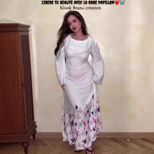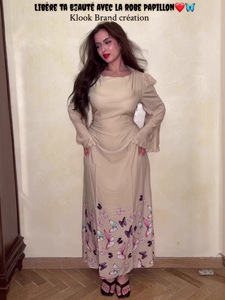亚马逊欧美2025秋季新款甜美蝴蝶印花连衣裙收腰系带长袖修身长裙