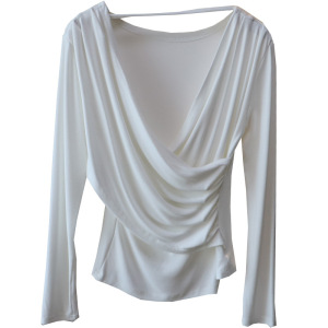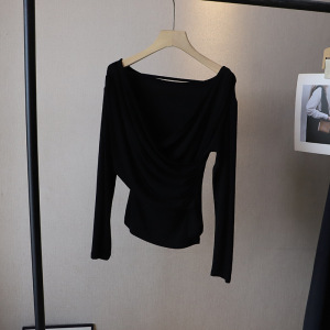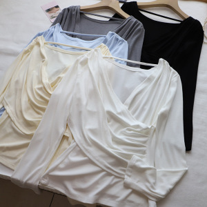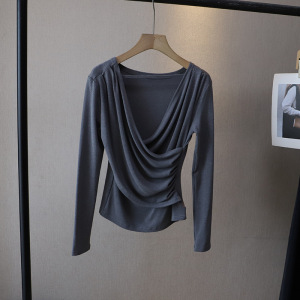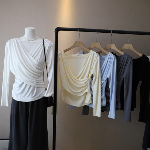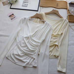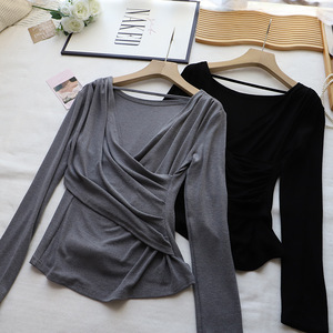 [比正]2025秋季新韩版V领个性短款抽褶交叉收腰显瘦长袖T恤女4757