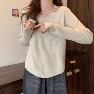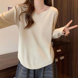 2025大码遮肚子正肩长袖V领打底衫女秋冬装胖妹妹不规则显瘦上衣