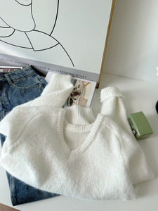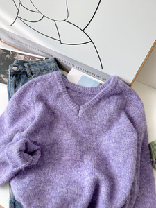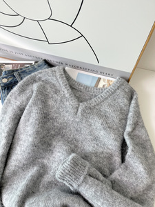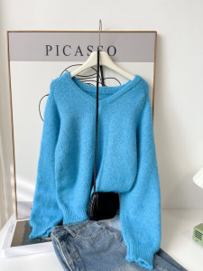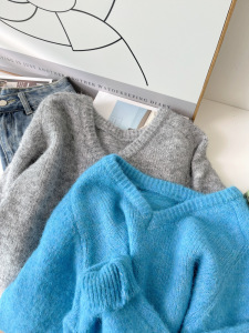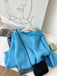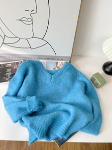 蓝色v领软糯仿浣熊绒毛衣女宽松慵懒风套头针织衫高级感上衣6156