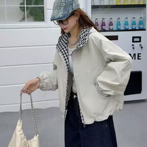 宽松格子拼接连帽短款外套女2025秋季新款时尚休闲百搭上衣夹克潮