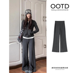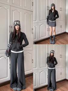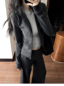 灰色条纹正肩外套女老钱风修身卫衣早秋薄短款气质夹克套装穿搭