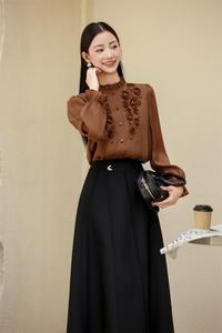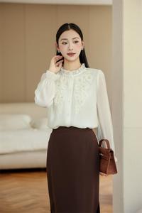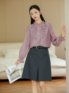 2025法式优雅风定位刺绣圆领长袖衬衫灯笼袖小上衣开衫紫色女秋