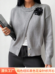 25秋冬跨境亚马逊女装高级优雅纯色纽扣黑色花朵针织套头衫