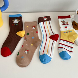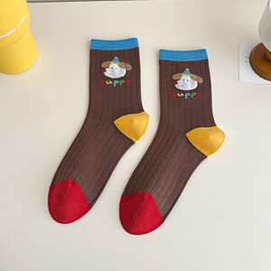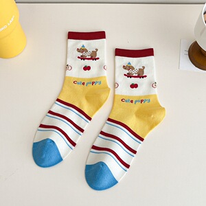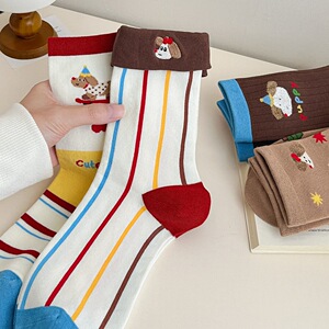 秋冬无骨韩国风袜子女可爱腊肠狗竖条纹精梳棉女士中筒学生袜子