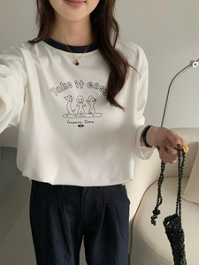 2025秋季新款韩系百搭撞色圆领长袖T恤宽松显瘦云朵绒打底衫上衣