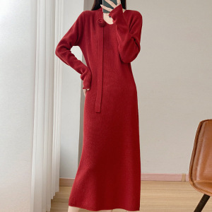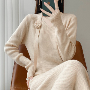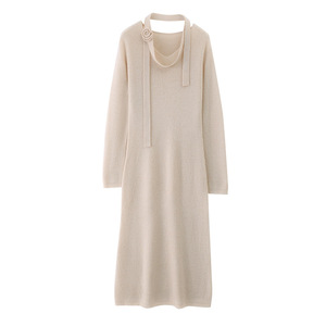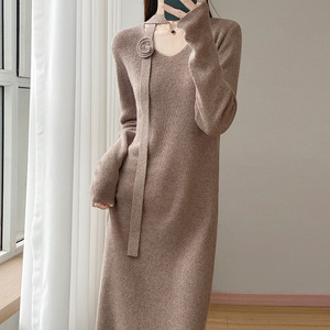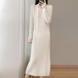 100丝光羊毛针织连衣裙女式V字领长裙子钩花绑带个性潮流范设计感