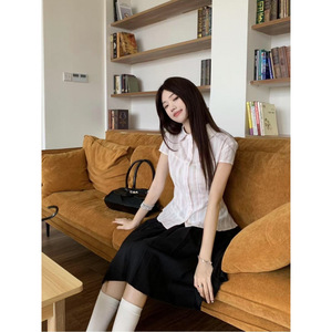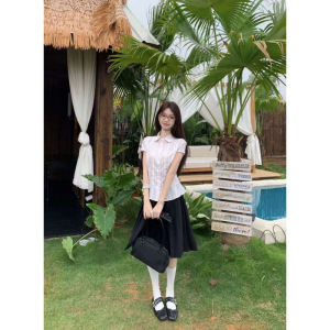 少女感时尚套装女百搭条纹翻领小飞袖短袖衬衫A字日系百褶半身裙