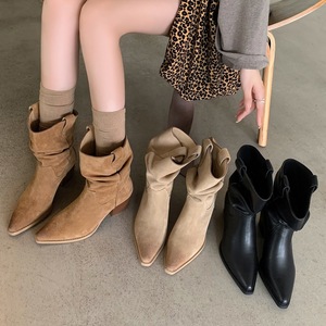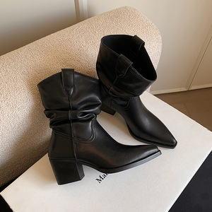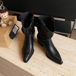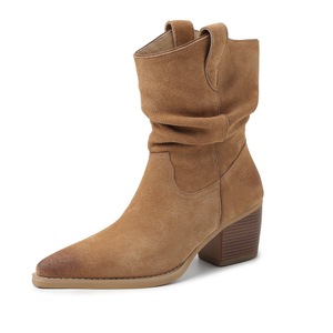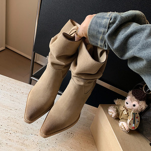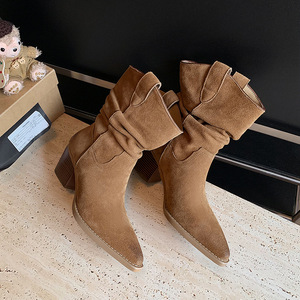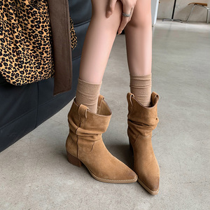 2025秋冬新款牛翻皮尖头西部牛仔靴子一脚蹬加绒显瘦粗高跟短靴女