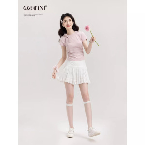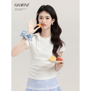 欧阳喜原创设计《茉莉花雨》蝴蝶结短袖女t恤夏2025新款修身上衣