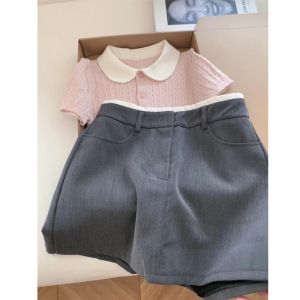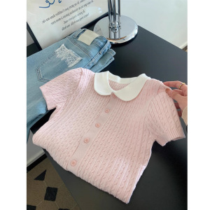 法式甜美温柔粉色娃娃领针织短袖T恤女夏季新款修身显瘦气质上衣