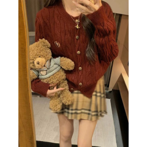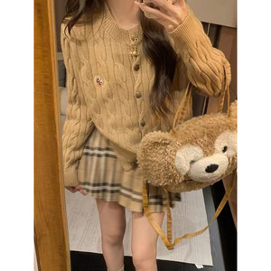 美式复古系粗麻花刺绣针织开衫女2025年秋冬季学院风毛衣外套上衣