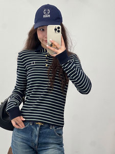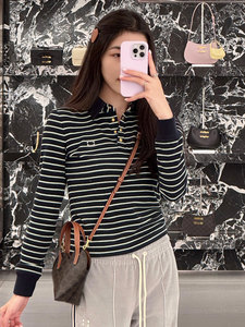 南油高货明星同款凯旋门刺绣蓝绿条纹金扣polo翻领长袖针织衫毛衣