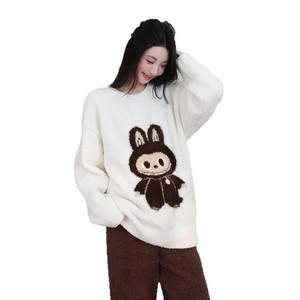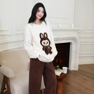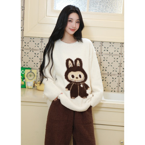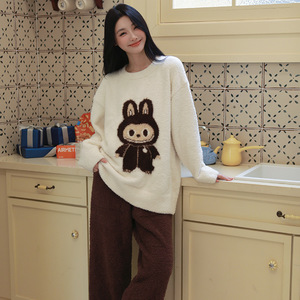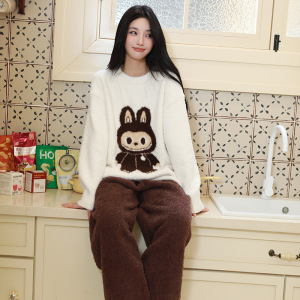 秋冬新款半边绒睡衣女士冬款珊瑚绒保暖加厚拉布布圆领套头可外穿