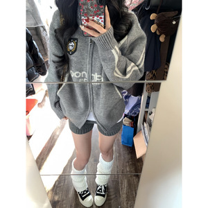 oversize翻领拉链毛衣开衫女2025秋装新款韩版宽松带标针织衫外套