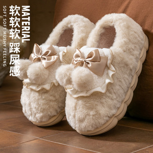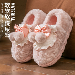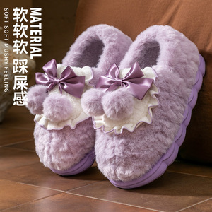 蝴蝶结棉拖鞋女士冬季2025新款室内家居防滑加绒加厚毛毛棉鞋男冬