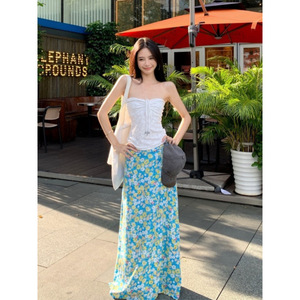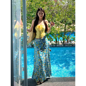 海边度假风套装法式抽绳抹胸背心上衣女夏季蓝色碎花半身裙两件套