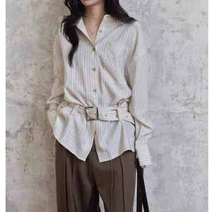 现货厂家批发 高智感收腰条纹衬衫女 设计感小z长袖复古上衣 女