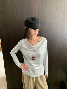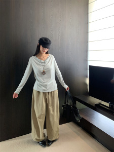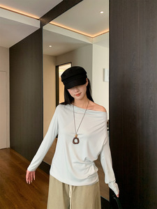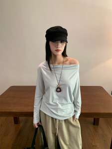 誉一新款2025秋季甜辣风纽扣斜肩t恤女宽松堆叠感长袖上衣女c208