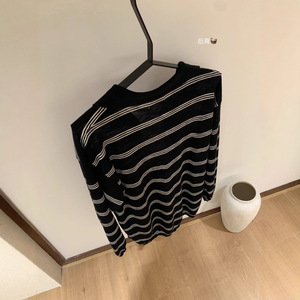 【WGWE】条纹V领微长袖T恤显瘦防晒罩衫宽松上衣长袖T恤W6855##