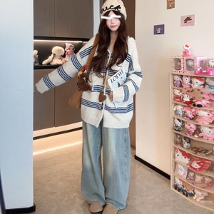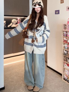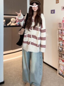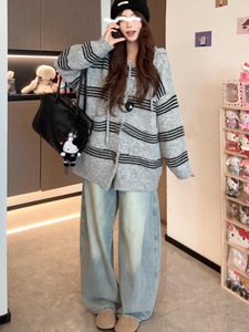 秋冬宽松休闲条纹连帽毛衣外套女中长款慵懒风松弛感针织开衫韩系