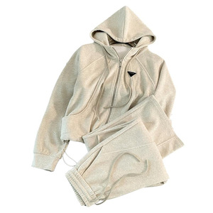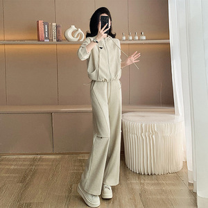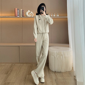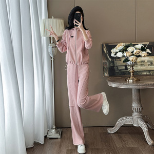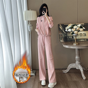 盐系风格休闲运动套装女秋冬款洋气减龄粉色外套上衣阔腿裤两件套