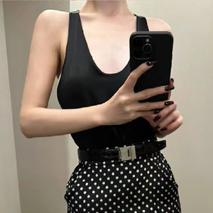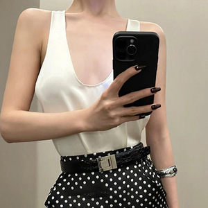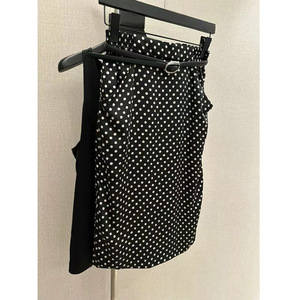 现货小香缎面U型领低胸百搭背心上衣波点印花包臀半身裙中长套装