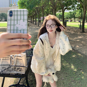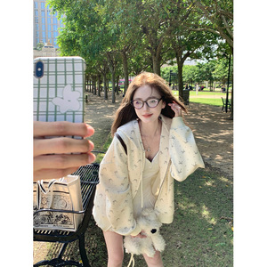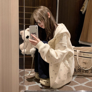 美式复古蝴蝶结满印连帽卫衣女春秋2025新款奶系甜美慵懒开衫外套