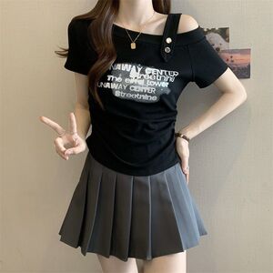 大码设计感洋气别致短袖t恤女夏季新款修身显瘦收腰短款露肩上衣