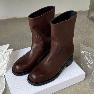 头层牛皮骑士靴女中筒靴女秋冬新款真皮圆头粗中跟套筒宽松单靴女