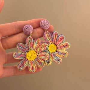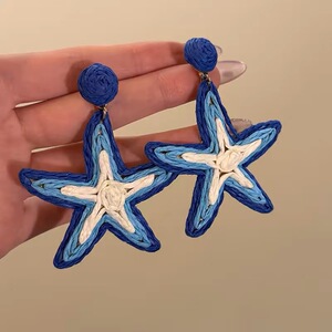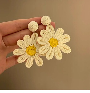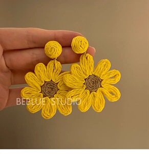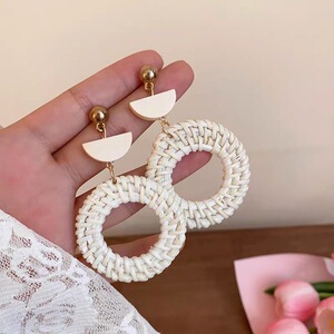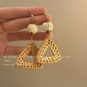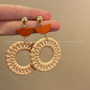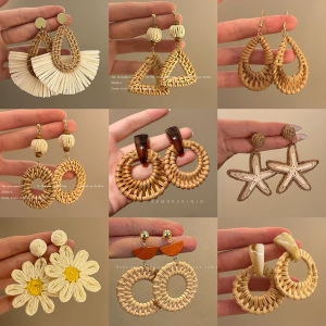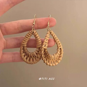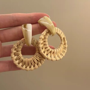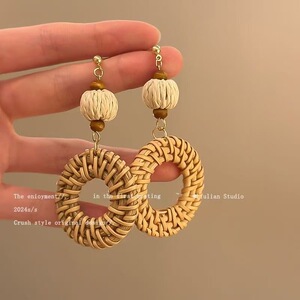 复古竹藤草编圆圈耳环女小众设计高级感气质夸张耳坠波西米亚耳饰
