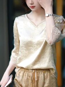 杏色V领七分袖T恤女2025夏季新款轻奢提花蕾丝拼接设计感大码上衣