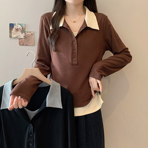 2025秋装新款胖mm大码女休闲百搭polo领撞色假两件长袖甜美上衣