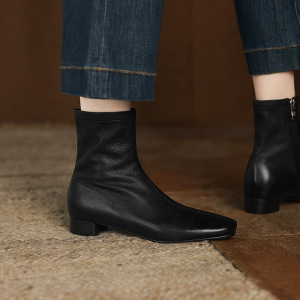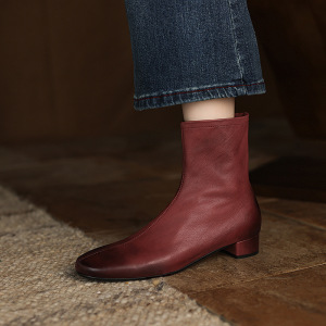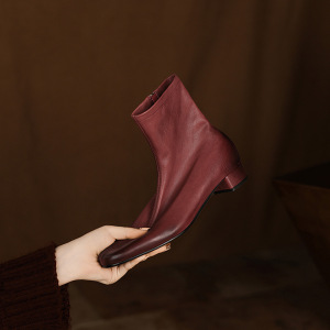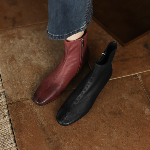 巨软小羊皮!秀气显瘦圆头擦色法式裸靴简约侧拉链短靴女 3CM粗跟