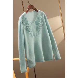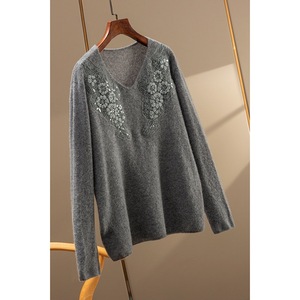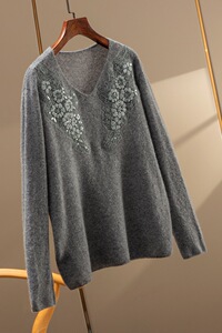 D春天 早鸟价!法G重工钉珠刺绣花纱100羊毛V领毛衣H女70C6 特