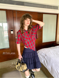 ovinsyang 美式复古红色辣妹短袖格子衬衫女短款系带上衣