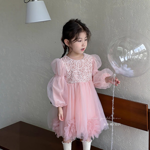 女童连衣裙2025秋季新款绝美超大摆粉色网纱蓬蓬裙周岁礼服公主裙
