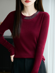 烫钻圆领精纺羊毛衫初秋新款修身打底衫女软糯舒适针织薄毛衣内搭