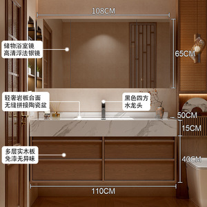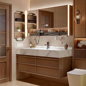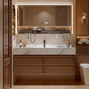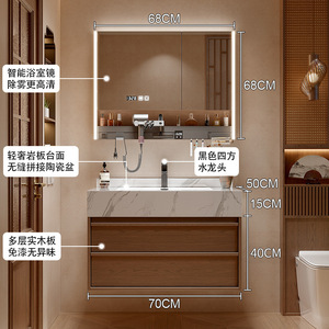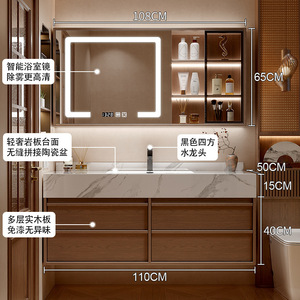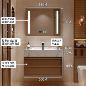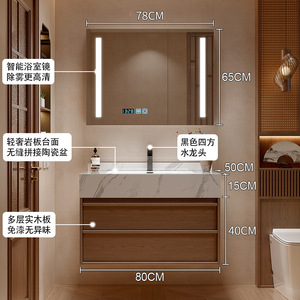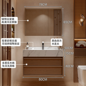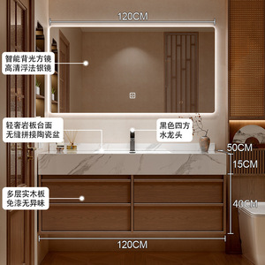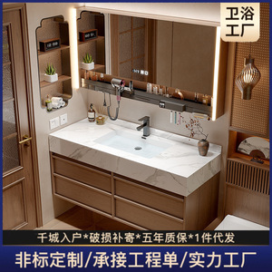 中古风岩板无缝陶瓷盆浴室柜组合洗漱池洗手脸盆智能镜柜实木卫浴