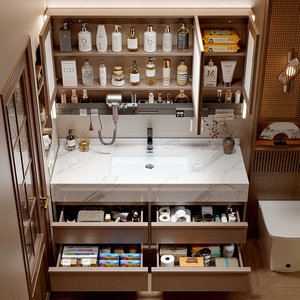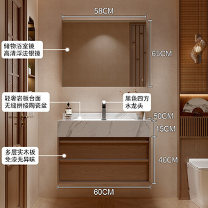 80CM岩板无缝陶瓷盆+智能收纳镜柜