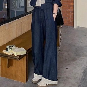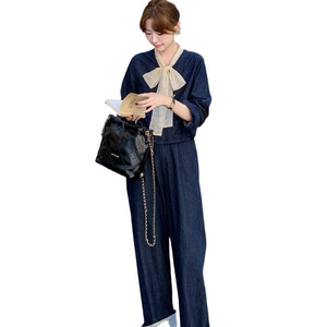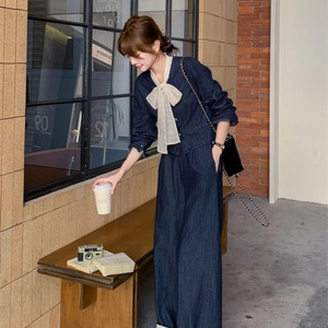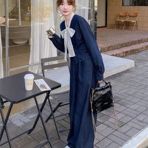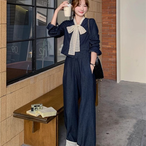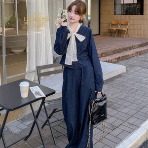 蝴蝶结牛仔套装女春秋阔腿裤两件套感小香风一整套韩系流行