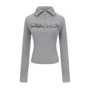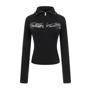Fudge Pink 25秋季New美式复古辣妹字母刺绣翻领套头毛衣