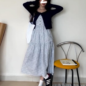 蓝色格纹吊带连衣裙子女夏季2025新款感早秋韩系穿搭一整套装拼接
