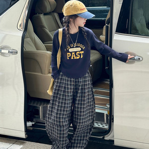 女童套装2025秋季新款字母印花长袖上衣格子裤两件套中大童阔腿裤