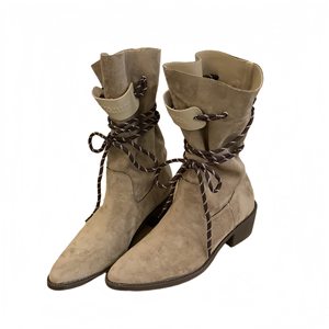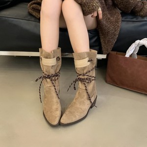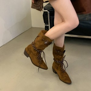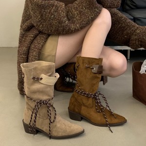 尖头法式时尚百搭绑带气质显瘦女靴2025秋冬新款粗跟绒面时装靴