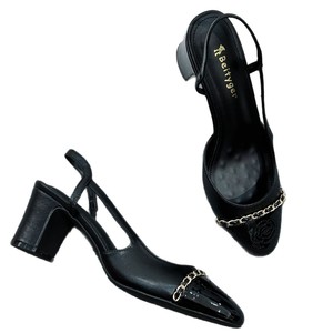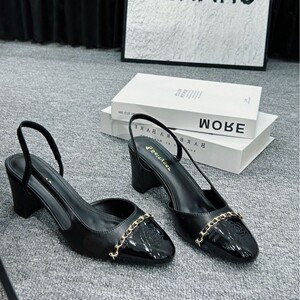 小香风同款2025秋季新款刺绣圆头拼色链条粗跟后绊带高跟包头凉鞋