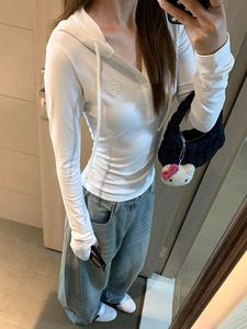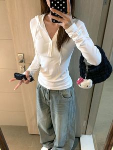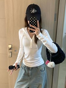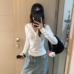 美式连帽亨利领正肩长袖t恤女早秋季修身打底衫收腰辣妹白色上衣